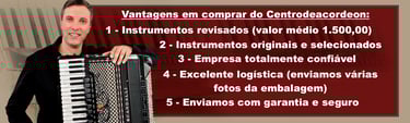 No Centro de Acordeon, oferecemos uma ampla variedade de acordeons selecionados em ótimas condições de uso, prezando sempre a originalidade de cada instrumento. Assim enviamos para todo o Brasil com qualidade e dedicação.